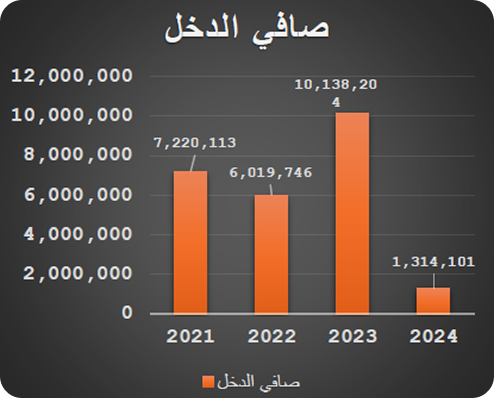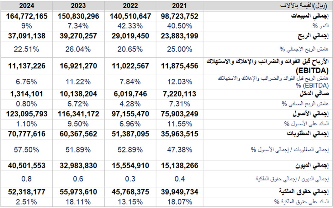 • سجل عام 2024م، قيمة 164.77 مليون ريال سعودي من المبيعات.فيما بلغت الأرباح 1.34 مليون ريال سعودي.